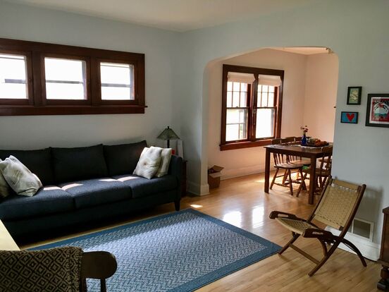 Bright three-bedroom house with hardwood floors, and lots of light! Three bedrooms and one bathroom upstairs; open floorplan (remodeled kitchen, dining room, living room) and sunporch downstairs. Unfinished basement with washer/dryer. One-car garage for car and bike storage, and ample street parking available.