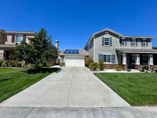Welcome to this stunning two story solar powered home for lease in Menifee, featuring a true backyard oasis complete with a sparkling pool! Offering over 3,300 square feet of living space, this spacious home includes 5 bedrooms, 3 full bathrooms, and an attached tandem 4 car garage. Inside, you'll find a thoughtfully designed floor plan, a neutral paint scheme, and numerous updates throughout. The expansive kitchen features rich brown cabinetry, granite countertops, stainless steel appliances, a pantry, and seamlessly opens to the dining area and large family room. The family room is warm and inviting with a cozy fireplace, custom built-in shelves, and an abundance of windows that flood the space with natural light. Downstairs also offers a formal living room, formal dining room, a full bathroom, and a bedroom. A custom-built pet crate is cleverly tucked under the stairs for your furry family members! Upstairs, you’ll find additional storage, the remaining bedrooms and bathrooms, and a spacious laundry room. All bedrooms are generously sized, while the primary suite is a true retreat, featuring a private balcony, and a luxurious ensuite bathroom with dual sinks, a soaking tub, a separate shower, and an oversized walk-in closet with custom built-ins! The 4 car garage is a dream come true with epoxy flooring, built-in storage, attic access, hanging fans, and a dedicated workbench area. Venture outside to your resort style backyard, where you'll enjoy a beautiful pool with a waterslide and spa, a custom firepit with builtin seating, a barbecue island/bar, basketball court, and a dog run, everything you need to feel like you're on vacation every day! Don’t miss your chance to lease this incredible home, schedule a private showing today!