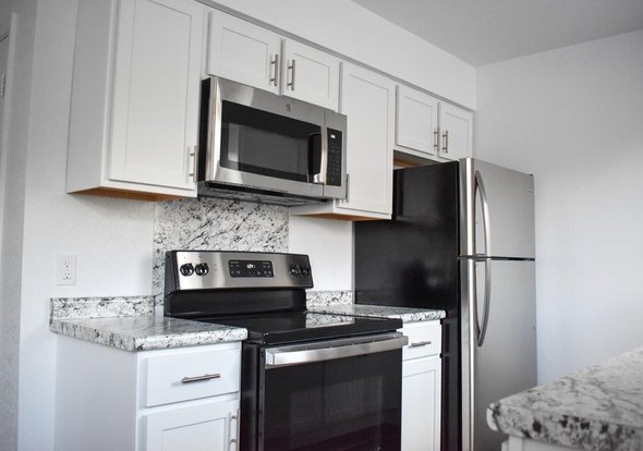 The kitchen is equipped with top-of-the-line stainless steel appliances, including a refrigerator, range/oven, and microwave. These modern amenities add a touch of elegance to your cooking experience.