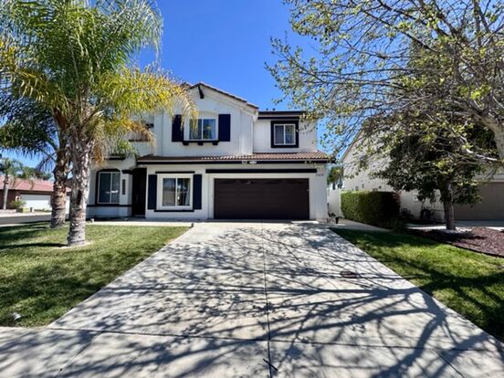 Welcome to this beautifully upgraded 5 bedroom, 2.5 bathroom two story home with a 2 car garage, ideally located in Murrieta, available for lease! This stunning residence sits on a spacious corner lot and boasts a striking black and white exterior color scheme, offering incredible curb appeal. Landscaping and solar are both INCLUDED, adding value and convenience. Enter inside to discover upgraded plank flooring, a neutral paint palette, crown molding, and a seamless flow throughout the home. The formal living room welcomes you and transitions effortlessly into the family room, which connects to the dining area and expansive kitchen. The kitchen is a chef’s dream, featuring two tone cabinetry, a large center island with upgraded lighting, stainless steel appliances, a built-in wine nook, ample storage, custom backsplash, and more! Just off the kitchen, you'll find a convenient half bathroom, laundry area, and direct access to the garage. A versatile bedroom is also located downstairs, ideal for guests or a home office. Upstairs, a spacious loft awaits, highlighted by elegant wainscoting and a stylish accent wall making it perfect for a second living area or playroom. Each upstairs bedroom is thoughtfully laid out to maximize privacy and comfort. The oversized primary suite offers a luxurious retreat with a fully renovated ensuite bathroom, complete with a dual sink farmhouse vanity, soaking tub, walk-in glass shower, and generous walk-in closet. Venture outside to enjoy the beautifully designed backyard, which features a mix of concrete and artificial turf, a mini putting green, fruit trees, and a charming gazebo covered patio area, perfect for relaxing or entertaining. This home is conveniently located near shopping, dining, schools, parks, and more. Schedule your showing today and experience all this home has to offer!