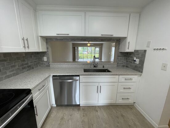 Welcome to the Annual Rental - 2/2 Condo in Abbey at Berkshire Village, a stunningly remodeled first-floor condo located in the heart of Naples, FL. This condo boasts two spacious bedrooms and two beautifully remodeled bathrooms, featuring marble-like tile work, white cabinets, and quartz counters. The split bedroom floor plan ensures privacy, while the large living room provides ample space for relaxation and entertainment. The condo is adorned with new wood plank vinyl flooring throughout, adding a touch of elegance to the overall aesthetic. The kitchen is a chef's dream, equipped with quartz countertops, stainless steel appliances, and white shaker cabinets. The condo also features a spacious walk-in closet for all your storage needs. Step outside to a large screened and covered lanai, offering a serene pool view - a perfect spot for your morning coffee or evening relaxation. The community pool is just a few steps away, ready for your enjoyment. Additionally, the convenience of having a laundry unit within the condo adds to the overall comfort and ease of living. Experience the perfect blend of luxury and comfort in this gorgeous condo at Abbey at Berkshire Village.