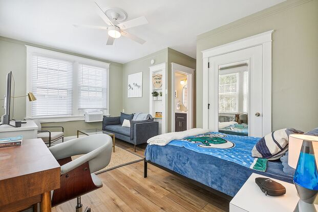 Renovated first floor studio apartment just 2 blocks from Tulane! Fully furnished. You'll love the fresh, sunny interiors with cozy den & large-screen TV, office space & gourmet kitchen complete with granite counters, breakfast nook & matching appliances. Highly desirable location, amazing historic building, close to the universities, Maple Street bars, Audubon Park & the parades on St. Charles. Brand new inside just bring your clothes and move in the same day. Optional mattress.