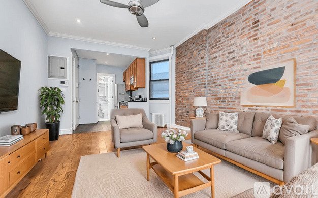 The apartment features a thoughtfully updated kitchen with a dishwasher, contemporary finishes, and ample storage, complemented by the convenience of an in-unit washer and dryer. Architectural details like custom doors, high ceilings, hardwood floors, and exposed brick add warmth and classic New York charm, while the modern bathrooms showcase clean, elegant design.