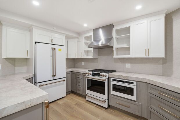 This light and bright unit has been fully renovated from top to bottom, featuring beautiful hardwood flooring throughout, modern walk-in showers, and a sleek, updated kitchen equipped with brand new appliances. The open layout creates a seamless flow between living, dining, and kitchen spaces, ideal for both everyday living and entertaining. The living room also includes a mounted flat screen TV for added convenience and enjoyment.