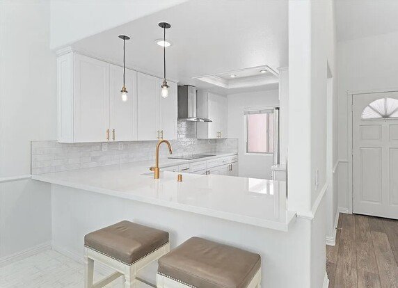 The remodeled kitchen is a true centerpiece, showcasing quartz countertops, custom cabinetry, and premium appliances, all flowing seamlessly into the open living and dining area.
