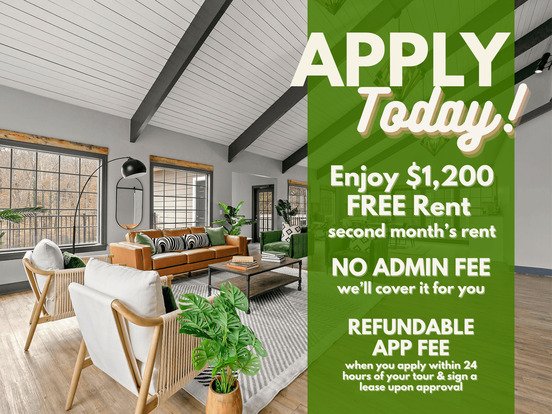 Receive $1,200 OFF second month’s rent + waived admin fee. Plus, if you apply within 24 hours of completing a tour and sign your lease upon approval, we’ll credit your application fee back to you.
