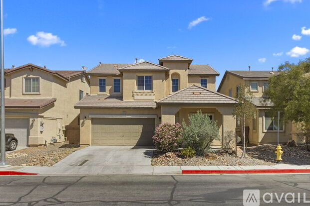 Beautiful 4 bedroom, 2.5 bathroom home located just 5 miles from Nellis AFB and only a 2-minute walk to Dusty Dickens Elementary School. With 1,869 sq ft of living space, this home offers a versatile floor plan with an open and inviting layout that feels both spacious and functional. The large backyard features low-maintenance desert landscaping, a paver patio, artificial turf, pergola, and a mature shade tree—perfect for relaxing, entertaining, or enjoying time with family. The kitchen is a standout, featuring granite countertops, a center island, and additional shelving in the pantry area for extra storage and organization. Additional highlights include an attached garage with custom overhead storage shelves—a huge space saver—and dual air conditioning units with separate upstairs and downstairs climate control. This home combines comfort, convenience, and great outdoor living in a fantastic location.