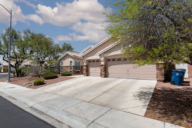 Welcome to this stunning single-story home located in a gated community in North Las Vegas. This 3-bedroom, 2-bathroom house boasts a spacious island kitchen with stainless steel appliances and granite counters. The three-car garage provides ample parking and storage space. Step outside to enjoy the covered patio, spa, and outdoor fireplace. The gated dog run with synthetic grass is perfect for your furry friends. The master includes direct access to a secondary bedroom that has been converted into a cavernous custom closet, providing plenty of storage space. Washer and dryer are included for your convenience. Don't miss out on this beautiful home with luxurious amenities!