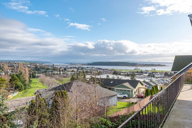 This inviting three-bedroom, 2.5-bath home offers beautiful views of the marina and downtown Oak Harbor, perfectly balancing convenience with a sense of privacy. Located close to shopping, dining, and everyday amenities. The main level is designed for comfortable living and features a spacious kitchen, dining room, and living room centered around a cozy gas fireplace, along with the primary bedroom and ensuite bathroom and a two-car garage for easy access. Downstairs, additional bedrooms and a full bathroom provide flexible space for guests, work, or relaxation. A wraparound deck invites you to enjoy the scenery, while lush, mature landscaping surrounds the home and enhances its warm, welcoming feel.