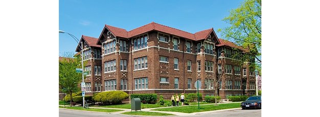 This lovely courtyard building is three blocks from the Green Line and grocery and across the street from Percy Julian Middle School.