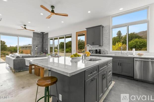 At the end of a quiet country road you have found a simple and tasteful property with just the right amount of refinement, nature and open space to feed your soul! The 2 bedroom main house is situated to take in the views, the studio style guest house overlooks the adjacent apricot farm, and the 3rd detached structure allows for another myriad if uses. Furnished however the furnishings in the photos are not the same now. Spend the day listening to the sounds of nature while taking a dip in the sparkling pool, or take advantage of this property being at the base of Ojai's beautiful mountains with opportunities for hiking, biking and horse back riding. The property boasts an extensive family orchard, over fifty varieties of roses adding color and brilliance to the stone paths that go from one house to the other. This solar-powered, stylish and peaceful piece of paradise has been developed with taste, beauty and utility in mind. Truly one-of-a-kind! Fully furnished option available at $6,000 per month with $12,000 security deposit.