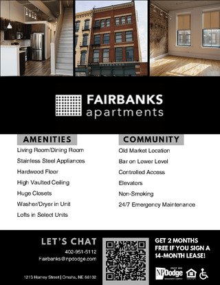 Fairbanks offers spacious apartment homes paired with modern comforts and timeless charm. Choose from thoughtfully designed studio, one-bedroom, and two-bedroom floor plans, ranging from 575 to 1,337 square feet. Each residence features open-concept layouts, high ceilings, and large windows that showcase stunning views of Downtown Omaha.