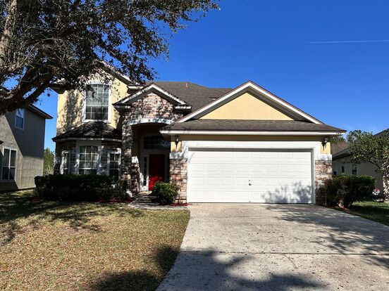 Timberlake at Oakleaf - This beautiful four bedroom two and a half bath home is waiting for you. With a formal living room, formal dining room and a spacious family room with a fireplace, the decorating possibilities are endless. The kitchen is just off the family room along with a breakfast nook that offers a view overlooking the lake. The primary bedroom is downstairs. The primary bathroom has a garden tub, separate walk-in shower and two sinks with a vanity area. There are three guest bedrooms upstairs with a loft area perfect for a play area or home office.