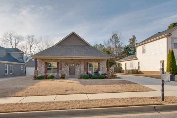 This charming home features an open floor plan with window coverings throughout. The spacious kitchen offers granite countertops, stainless steel appliances, and a farmhouse sink. The living room includes wood floors, a gas fireplace, and built-ins, creating a cozy and welcoming space.