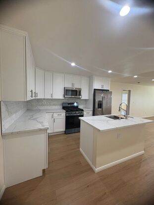 Beautifully remodeled single story, two bedroom, one bathroom house with one car garage next to unit. New refrigerator, microwave, range, and dishwasher included in highly updated kitchen with island. Kitchen has white shaker cabinets and Quartz countertops.