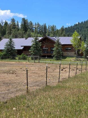 Welcome to this ranch style home centrally constructed on 5 lush acres landscaped with well placed blue spruce and aspen. Beautiful north range mountain views from the living room and covered front porch with an amazing back yard that is very close to national forest. The total foot print is 3,107 sf with front/back covered porches and attached 3 car garage. It is a 3 bedroom, 2.75 bath. The floor plan has very spacious feel as the living room has exposed vaulted timber with tongue & groove knotty, (western) yellow pine. It's large windows convey tremendous natural light bringing the outdoors in. The kitchen is simple by design and very functional with beautiful French doors leading to the den/tv room. The shop is separate from the home and is excellent for wood working, mechanics or just storing the recreational toys. It's approximately 1,168 sf. The pole barn is approximately 2,000 sf and is excellent for heavy equipment and dry storage.