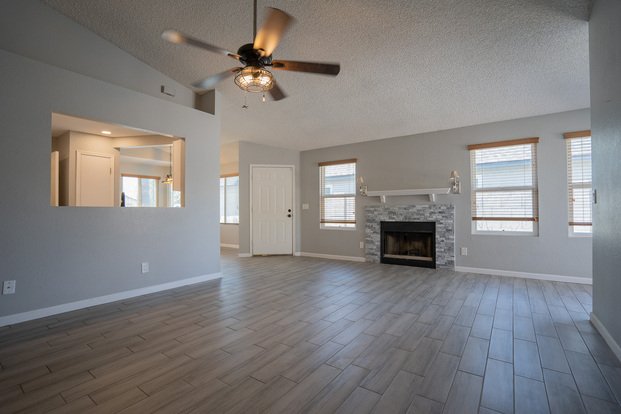 A rare treasure in radiant Peoria, this enchanting 3/2 sanctuary weaves warmth and elegance in every corner. Enter into a welcoming living space, where a striking fireplace sits beneath vaulted ceilings, framed by rich, wood-look floors flowing like poetry. The kitchen, designed with both function and flair, features sleek stainless steel appliances and thoughtfully crafted cabinetry. The spacious master suite invites serenity, boasting a spa-worthy ensuite with dual sinks, a soaking tub, and a generous walk-in closet. Guest rooms echo comfort and charm. Revel in golden mornings or starlit evenings on your expansive covered patio. With a lush private backyard and 2-car garage, this home is a timeless symphony of style and soul. Great location!