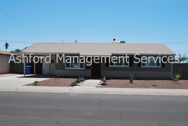 20th St/Northern. Charming remodeled single story home with 3 bedrooms and tons of charm! Living room, eat in kitchen with stainless appliances including fridge, dishwasher and gas range. Subway tiled backsplash. Ceiling fans and 2 inch blinds throughout. Beautiful vessell sink in hall bath. Primary bedroom has ensuite 3/4 bath with vessell sink and tiled walk in shower. Separate laundry/storage room off carport with full size washer/dryer included. One car carport. Huge backyard great for entertaining with patio and brick paver extended patio slab, mountain views. Close to parks, hiking, bike/walking paths, transportation and freeway access. Assistive animals only.