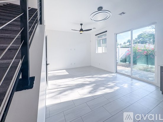 The modern, open concept kitchen showcases arctic white quartz countertops, stainless steel appliances along with modern custom cabinetry complete with black matte hardware. The first floor kitchen and living room space boasts very high ceilings, and tall sliding glass doors opening to the patio to create an indoor/outdoor entertaining dream! Windows treated with sleek charcoal blackout, room cooling window shades that disappear when drawn in order to showcase the picturesque views.