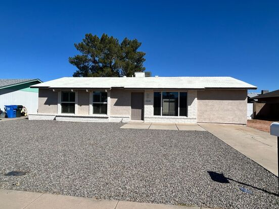 Tile throughout so *NO* carpet! Main living area includes an open concept den, dining and kitchen. Kitchen includes a stainless steel sink, fridge and stove. Full laundry room with washer/dryer hook ups and shelving. Very large guest bedroom near front of home with side-by-side closet. Two other nice sized bedrooms with side-by-side closets and they all share a hall bathroom. Primary bedroom with private bath that includes tiled shower. Large lot with new rock in front yard + *NO* HOA. Close proximate to State Farm Stadium with tons of shopping + restaurants. Home is friendly to a max of two spayed/neutered pets with $400.00 per pet fee.