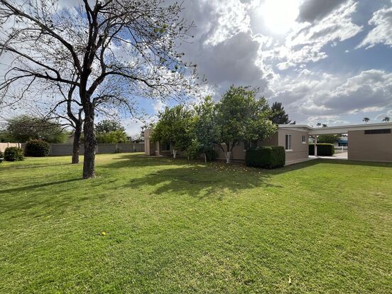 Enjoy a spacious backyard featuring lush grass and mature lemon and pecan trees, perfect for outdoor activities or relaxation.
