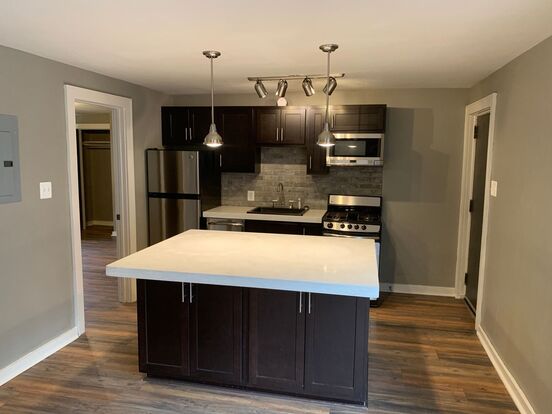Modern Kitchen with upscale appliances, stylish quartz countertops, dishwasher, unique industrial lighting, and IN UNIT LAUNDRY! OFF STREET GARAGE SPACES AVAILABLE!!!