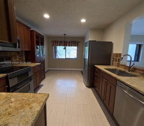 Bridgwater community. This beautiful corner coach townhome features 1 car garage, shutters throughout, split floor plan, living room & dining room, vaulted ceilings, remodeled kitchen w/ cherry kitchen cabinets, granite counter tops, stainless steel appliances (fridge 1 yr, microwave 3 yrs, new dishwasher), pantry, & recessed lighting. Large master bedroom w/ remodeled bathroom, large walk-in custom closet & 2nd wall closet, screened-in balcony accessible from master bedroom and living room. Enjoy the water views from all bedrooms & living room. Community pool & clubhouse. Located close to shops, hospital, Sawgrass, Broward mall & Panther stadium, dining, all major