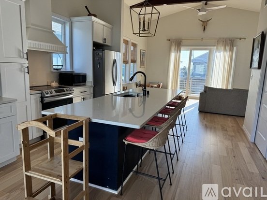 The main upper level is 1050 square feet and features tall ceilings and 4 sliding glass doors that flood the house with natural light. There are 2 bedrooms and 2 bathrooms, a large quartz island, and exposed wooden beams. The back deck off the main bedroom and kitchen is the perfect place to have your morning coffee while the front deck is made for watching the sunset over the bay while sipping some wine.