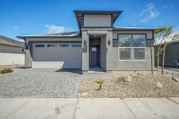 New build in the new South Ranch Community. The front entry hall passes 2 large guest bedrooms, and a full guest bathroom on the right. On the left is another hallway with access to the 2 car garage with EV charging outlet. Also the laundry room, a niche for a drop zone, and a pocket office. Continuing to the back of the home is the large living room with ceiling fan, dining room, and kitchen with polished granite countertops, all stainless steel appliances including a 5 burner stove, a large island with sink, and dishwasher, and 3 black and gold pendant lights above. Walk in pantry. Between the dining room and the kitchen is the entrance to the primary bedroom with ceiling fan, and en-suite bathroom. Vanity with dual sinks and granite countertops, large walk in shower, water closet, and walk in closet with generous amounts of storage shelves and hanging rods. The backyard has an extended patio, new trees, irrigation, and rock landscaping. Home sits on a cul-de-sac with views from the front yard of Granite Mountain. Street parking is non permitted in this community.
