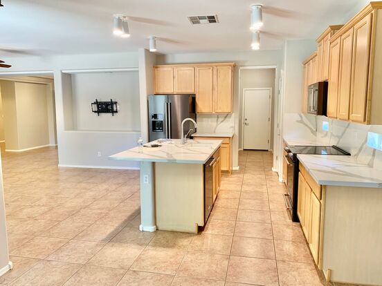 This beautiful home is a 4 bedroom, hard to find -single level, located near the Queen Creek/Gilbert border. Light and bright open-concept floorplan with gorgeous quartz kitchen countertops and backsplash. The large kitchen island has room for seating plus there's ample space for an eat in kitchen table. The kitchen features high end KitchenAid appliances and a huge walk in pantry. Primary bedroom and ensuite has dual closets, separate shower and soaking tub plus a slider door out to the patio and backyard. Secondary bedrooms are spacious with newer carpet and paint, and tile in all the right locations. Large, easy to maintain back yard, fig tree, usable shed and covered patio. Washer and dryer are included. Extended width driveway and lovely courtyard style entry. This home has a newer AC unit and is move in ready!!