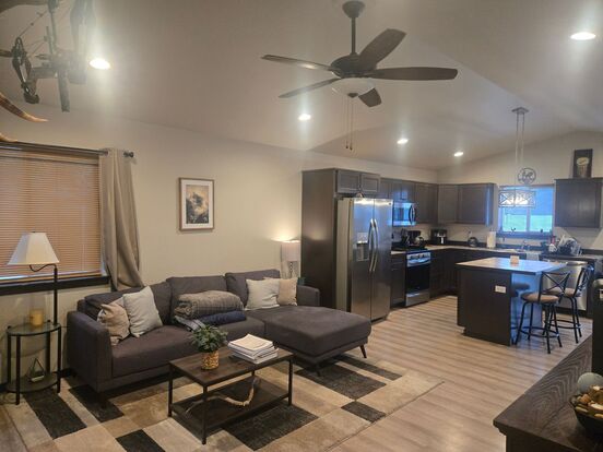 The kitchen features dark cabinetry, stainless steel appliances, a large center island with seating, and opens seamlessly into the living and dining areas. Vaulted ceilings, recessed lighting, and ceiling fans add to the open feel, while durable LVP flooring runs throughout the main living spaces.