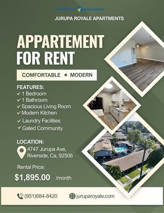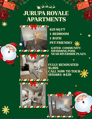 Bringing comfort home! Jurupa Royale is one of Riverside’s best kept secrets, conveniently located on Jurupa Avenue between Grand Avenue and Palm Avenue. The Riverside Plaza invites you to enjoy a day of shopping or dinner out after a quick drive in your car or public transportation. Jurupa Royale Apartment Homes offers spacious studios, 1- and 2-bedroom floorplans. With well-designed space, oversized living rooms, gourmet kitchens, spacious bedrooms and large closets you’ll feel right at home. Select apartment homes have a peaceful view overlooking the courtyard . All homes offer wall unit air conditioners. For your convenience, two laundry centers are offered onsite and open 24 hours. Jurupa Royale is a pet friendly community welcoming dogs and cats of all sizes with limited breed restrictions. Call us today to get information on our available apartment homes!