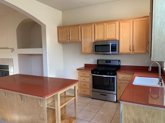 Spacious open kitchen boasts Corian countertops, an island, for breakfast bar, eat-in kitchen/dining area. stainless steel gas range, dishwasher and microwave -- plus new 16x16 "Brazilian slate" porcelain tiles. All cabinets are maple throughout. All living areas and hallways have new wood laminates installed; all bedrooms have vinyl planks. All ceilings are 10 feet high. Master is 14x16 ft with walk-in closet; dual sinks in bathroom, large soaking tub and separate shower. Secondary bedrooms are 11x10 ft each. All rooms have ceiling fans with light. Master Bath has separate soak tub and shower stall. Indoor laundry. Two car garage.