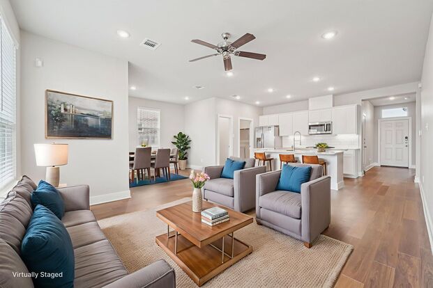 Natural light pours into the open living area, enhanced by rich wood-style flooring and ceiling fans throughout for year-round comfort. The home comes complete with a washer and dryer, so you're move-in ready from day one.