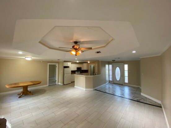 This spacious 3-bedroom, 2-bath residence offers comfort and style with tile flooring throughout and an open, beautiful kitchen and featuring a lovely wood-burning fire place. The master suite is a luxurious retreat, complete with 2 sinks, a shower, and a relaxing Jacuzzi for unwinding after a long day. Enjoy the convenience of an in-unit washer and dryer, and keep the backyard pristine with the included lawnmower. Whether you're entertaining or relaxing, this home blends functionality with elegance in a sought-after neighborhood. Schedule your viewing today and make The Bluffs your new beginning!