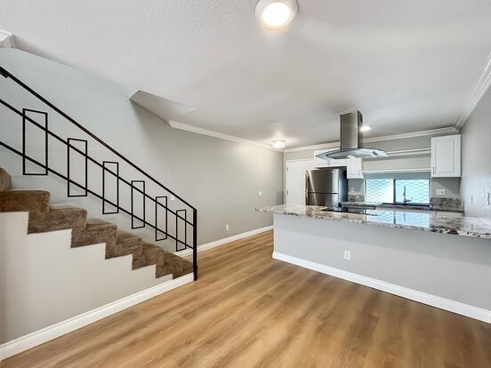 Welcome to this stunning 3-bedroom, 2-bathroom, 2-story unit located in the desirable Clairemont Mesa neighborhood. Offering 952 sq ft of living space, this home features an open layout with large windows and skylights that fill the space with natural light, creating a bright and inviting atmosphere. The updated kitchen is equipped with stainless steel appliances and ample counter space, while the modernized bathrooms add a touch of elegance. Downstairs boasts beautiful hardwood-style flooring, while the upstairs bedrooms are carpeted for comfort and feature mirrored closet doors. A carpeted staircase leads to a spacious loft. Additional highlights include wall heaters, a washer and dryer, a private back patio perfect for enjoying the California sunshine, and two reserved parking spaces for convenience. With its stylish finishes and great location, this Clairemont Mesa home offers the perfect blend of comfort and functionality.