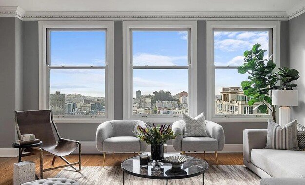 Perched atop Nob Hill in San Francisco's iconic Art Deco landmark, this 1,250 sq. ft. corner home blends timeless elegance with thoughtful modern upgrades. A reimagined floor plan with two full baths rare in the building and windows on three sides fills the interiors with light and sweeping views toward Pacific Heights, the Presidio, and the San Francisco skyline. The entry foyer, illuminated by Murano glass lighting, opens to gracious living and dining spaces with crown molding, hardwood floors, and classic craftsmanship. The chef's kitchen features natural stone counters, mill-grade cabinetry, pantry storage, and premium Bosch appliances with dual sinks. The primary suite enjoys a corner orientation, peek Bay views, generous storage, and an artisan-tiled en-suite bath with a multi-fixture tub and shower. A second full bath stuns with mosaic detail, while in-unit laundry enhances convenience. Building amenities include 24/7 door person service, private storage, a residents-only patio, and a large parking space that fits 1+ cars.