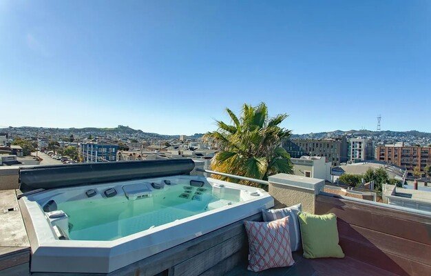The penthouse loft you've been waiting for, featuring panoramic San Francisco views from two private decks including one with a private hot tub. This sun-drenched home offers an open-concept layout with striking architecture and concrete floors throughout the main level, ideal for entertaining. The renovated kitchen features quartz countertops, glass-tile backsplash, sleek cabinetry, stainless steel appliances, and a breakfast bar. A spiral staircase leads to an expansive upstairs bedroom with new wood floors, full bath, and custom wall art. Enjoy stunning views from bed or step out to your private astroturf deck and unwind in the hot tub. Smart-home features include Nest, August lock, and Philips Hue lighting. Additional highlights include a half bath, in-unit W/D, one-car parking with storage, and a prime location near tech shuttles, transit, freeways, and top dining spots like Trick Dog, Tartine, and more.