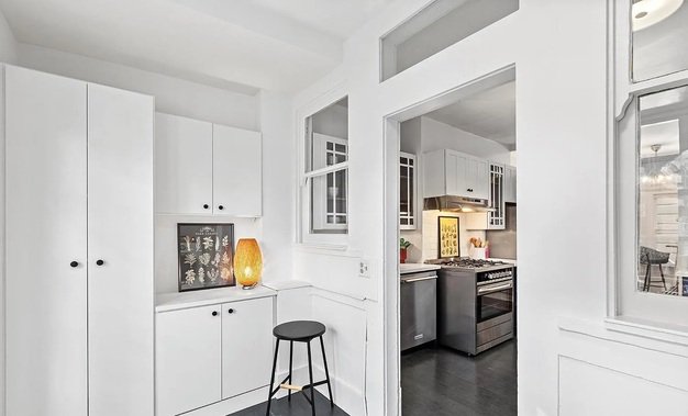 Charming one bedroom one bath unit. updated bathroom has a large shower and built-in storage, and the living room is open to the eat-in kitchen with quartz countertops, white tile backsplash, ample cabinetry and stainless-steel appliances. The rear laundry porch has a stackable washer/dryer with built-in storage and shelving.