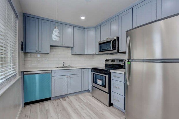 Offering a beautifully renovated 1 bedroom, 1 bathroom apartment. Modern kitchen has pale blue cabinets, brand new black and stainless steel appliances which include, dishwasher, refrigerator, electric oven and glass range cook top, microwave over stove doubles for as cooking ventilation. New beach wood looking laminate flooring in the kitchen and bathroom, new carpet throughout.