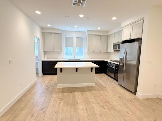 Bright great room with LVP wood flooring leading to open concept gourmet kitchen. Upgraded chef's kitchen with quartz slab counters, custom tile backsplash, stainless steel appliances, island, LVP wood flooring, walk-in pantry and eating nook. LED lighting throughout. High ceilings throughout. Half bath with LVP wood flooring and pedestal sink. Top floor with laundry closet with washer and dryer included. Hall bath with tile flooring, tub/shower combination and modern cabinetry and lighting. New interior paint and new carpet flooring. Master bedroom with new carpet flooring, dual walk-in closets with organizing systems and private bath. Master bath with dual vanities, tile flooring, spacious step in shower and separate water closet. Two additional bedrooms with new carpet flooring and closet organizing systems. First floor with hallway cabinetry and direct access to the oversized two car garage. Builtin garage has an additional tandem large space for bikes or possible third small car. Covered balcony located off of great room. Close to shops, restaurants, I-680, Bishop Ranch and the new City Center.
