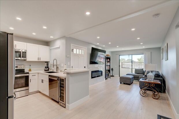 The kitchen boasts newer white shaker-style cabinets, modern appliances, including a small beverage fridge, and ample cabinet space, perfect for those who enjoy cooking.