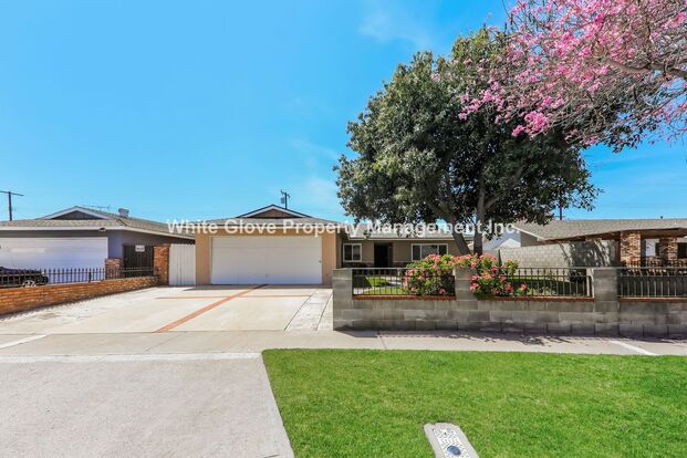Great house on quiet cul-de-sac in family friendly neighborhood. Open family room and dining room with gas fireplace. Beautifully remodeled kitchen with refinished cabinets, new counters and gas range. Primary bedroom with attached bath. 2 guest bedrooms and spacious hall bathroom. Great backyard with covered patio, large grass area and a huge mango tree. Home features Fresh paint, new carpeting, central heat, washer/dryer hook-ups and 2 car garage. No pets, please.