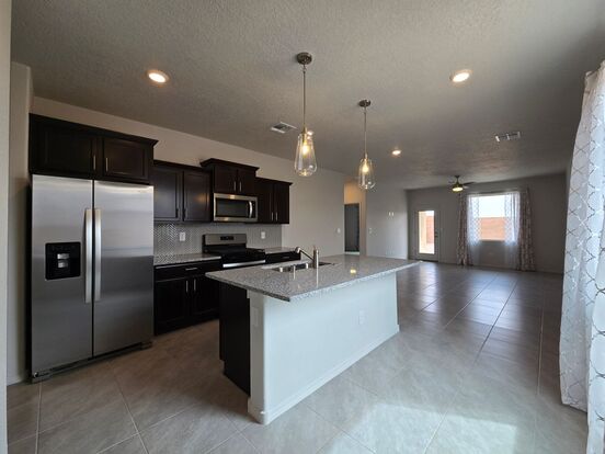 Available for lease in South Santa Fe’s desirable Sagrado neighborhood, this newly built 2025 home offers 1,420 square feet of modern living. Featuring 3 bedrooms and 2 bathrooms, the open-concept layout seamlessly connects the living, dining, and kitchen areas—perfect for everyday living and entertaining. The kitchen is equipped with a gas stove/range, refrigerator, and dishwasher, while tile flooring throughout the main areas adds durability and style. All bedrooms have cozy carpet and closets, with the primary suite boasting a walk-in shower, spacious walk-in closet, and private en-suite bathroom. A two-car garage offers convenience, and the fully walled backyard with a covered portal provides the perfect outdoor retreat. Located in a growing community in South Santa Fe, this home blends comfort and practicality in a beautifully designed space. Brant Goodman, Qualifying Broker