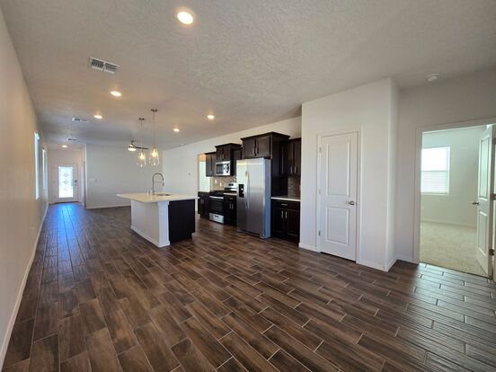 Now available for lease in the newly developed Sagrado neighborhood of South Santa Fe, this 2025-built home offers modern comfort and style. Featuring three bedrooms and two bathrooms, including a spacious master suite with a walk-in closet and ensuite bath with a walk-in shower, this home is thoughtfully designed. Enjoy the open-concept living, dining, and kitchen area—perfect for entertaining. The modern kitchen includes a gas range, refrigerator, dishwasher, and ample counter space. Durable tile flooring runs throughout the kitchen & living area, and carpet is in the bedrooms. Additional highlights include central air-conditioning, gas forced-air heating, and a dedicated laundry room with washer and dryer. Step outside to a walled backyard with a covered portal, ideal for relaxing or entertaining. A two-car garage completes this inviting home. Brant Goodman, Qualifying Broker.
