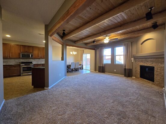 This spacious four-bedroom, two-and-a-half-bathroom home offers comfort and privacy in a handsome living space. The large backyard is a true retreat, featuring a high fence, beautiful pavers, and lush landscaping with grass and aspen trees—perfect for relaxing or entertaining. Inside, the two-story layout provides ample space, with a spacious living room and a gas fireplace, plus a second upstairs living area for added flexibility. The large, functional kitchen boasts dark wood cabinets and stainless steel appliances, just next to a roomy dining area, while each bedroom features a walk-in closet for plenty of storage. The master suite is a standout, offering a walk-in shower, tub, and a generous walk-in closet. Additional conveniences include a two-car garage, a dedicated laundry room with extra storage, and included washer and dryer. Located near neighborhood parks, this home combines space, style, and convenience in one inviting package.