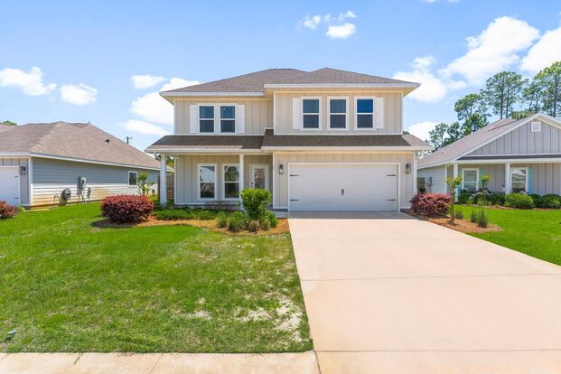 25 Krewe Circle is tucked away in a bayside community off of Goldsby Rd. This home has 2440 sqft of living space with the main living area, half bath and master suite on the first floor. Large bonus area shares the second story with 3 additional bedrooms and 2 full baths. Coastal lighting, gold fixtures and plenty of storage in the spacious kitchen ready for friends and family gatherings.