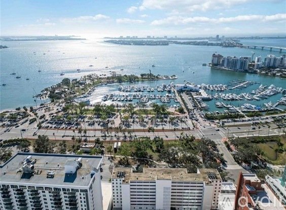 Fully-Furnished. Beautiful corner 2/2 with treetops and partial bay views, in the best downtown location. MCM architectural gem designed by Tim Seibert. Leave your car at home! Steps to free trolleys to Siesta Key or Lido Key and to everything downtown has to offer. Sparkling, heated pool with shower rooms and huge furnished pool deck. Party Room with full kitchen and dining table. Library with piano, fitness room with shower, bike storage. On-site building manager,