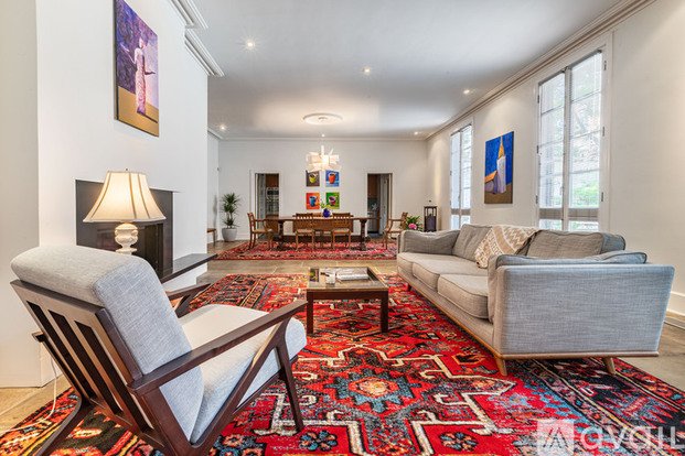 Entering into the home, you'll step into the kitchen that has been preserved and modernized with stainless steel Subzero, Fisher & Paykel appliances. In addition to the high-end appliances, you'll find that the cabinets are fully stocked with all of the essentials you need to prepare meals or entertain. The living and dining room are one voluminous space with slate floors, which boasts with natural light from the floor-to-ceiling doors that open to the garden. The notably tasteful furnishings and immersive artwork that have been selected for this home create a warming and eclectic feel, while maintaining the homes minimalist design.