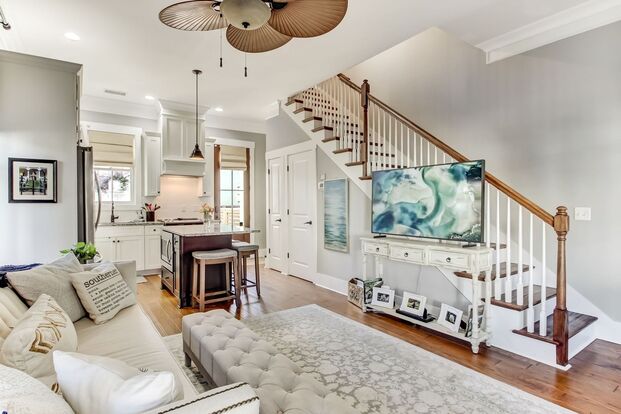 - Open concept floor plan with gleaming hardwood floors.